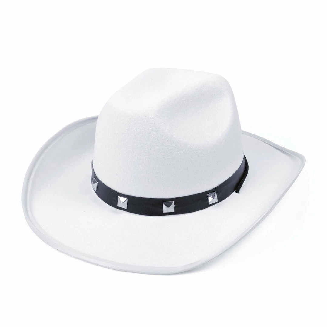This super value white cowboy felt style hat, complete with studded band will complete the finishing touch to any western outfit.
