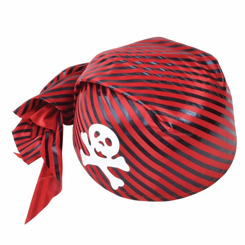 Our Red and Black striped pirate hat with tie at the back, is perfect for the finishing touch to your Pirate costume.