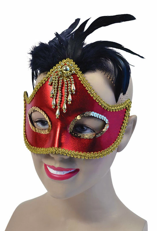 Red mask with black feathers and gold beads