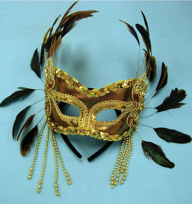 White feathered mask with brocade and bead trim.