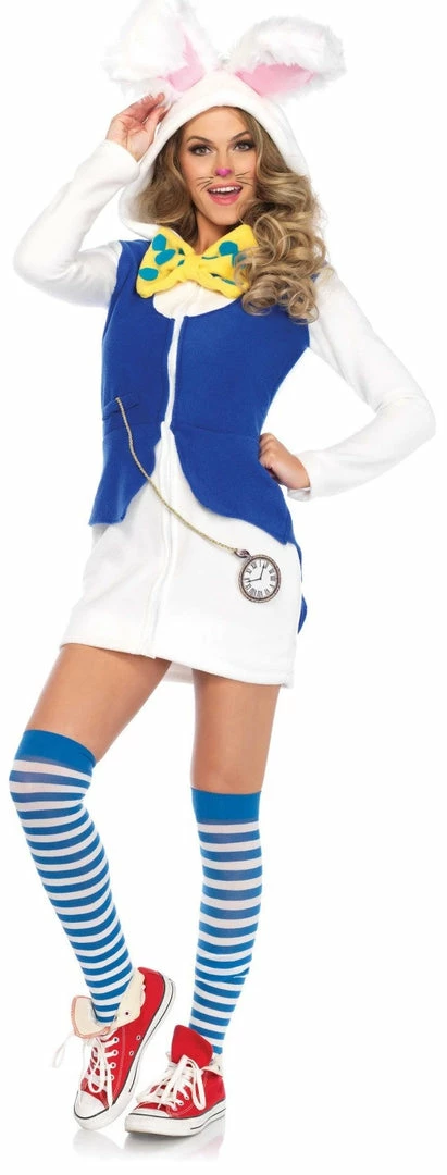Our Leg Avenue Cozy White Rabbit features zipper front dress with bow tie, furry ear hood, tail and attached velcro cross body pocket watch.