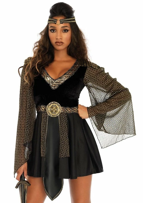 Our Leg Avenue, 2PC Glamazon Warrior costume includes stretch velvet dress with faux chainmail mesh sleeves and braided sequin trim, attached faux leather panel ornate medallion accent, and matching O-ring headband.