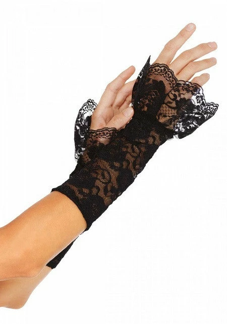 Our leg avenue stretch lace gauntlet arm warmer has a scalloped lace ruffle trim.