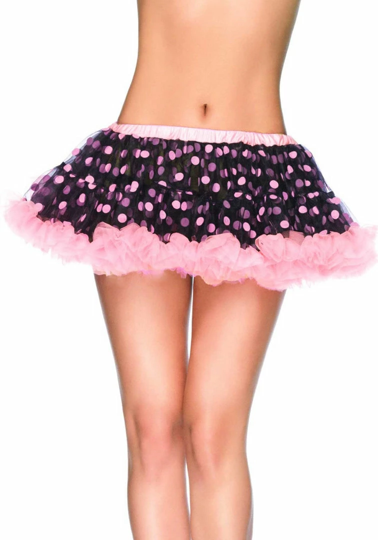 Our Leg Avenue, Mini Chiffon Petticaot is perfect to give any costume that extra bit of volume! With is black base and light pink polka dots and ruffle trim this cute petticoat will give you that extra girly feel.