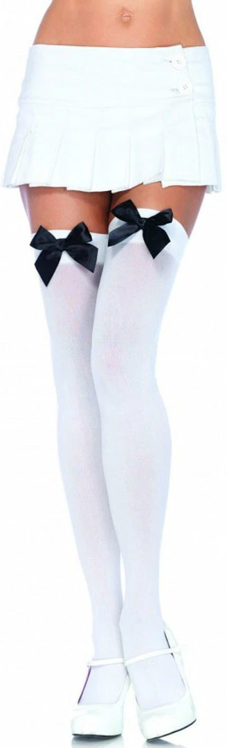 Our Leg Avenue, White with Black Bows Nylon Thigh Highs are great to add a touch of glamour to your costume. One size.