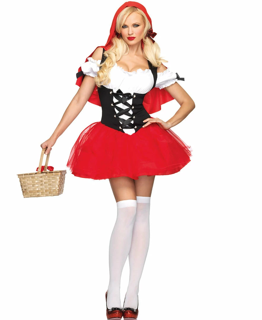 Our Leg Avenue, Racy Red Riding Hood costume includes a dress with attached hood.