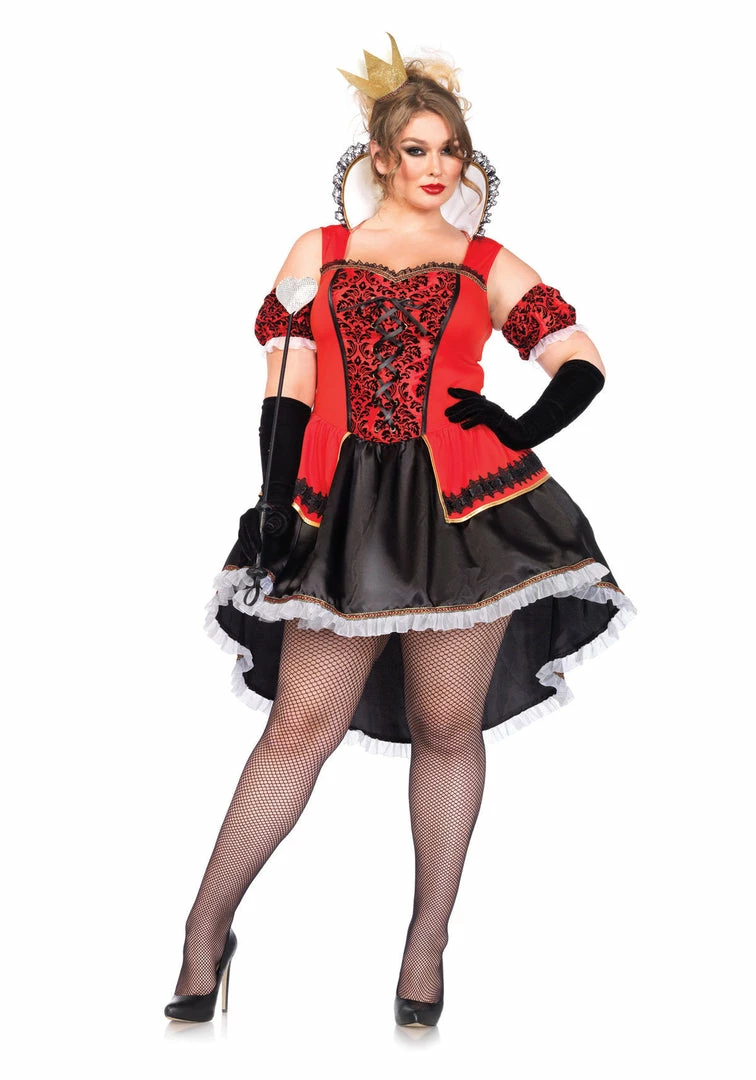 Our Full Figure, Leg Avenue 3PC. Royally Sexy Queen, includes high/low satin and brocade halter dress with woven ribbon venetian lace trim, matching arm puffs, and crown headband.