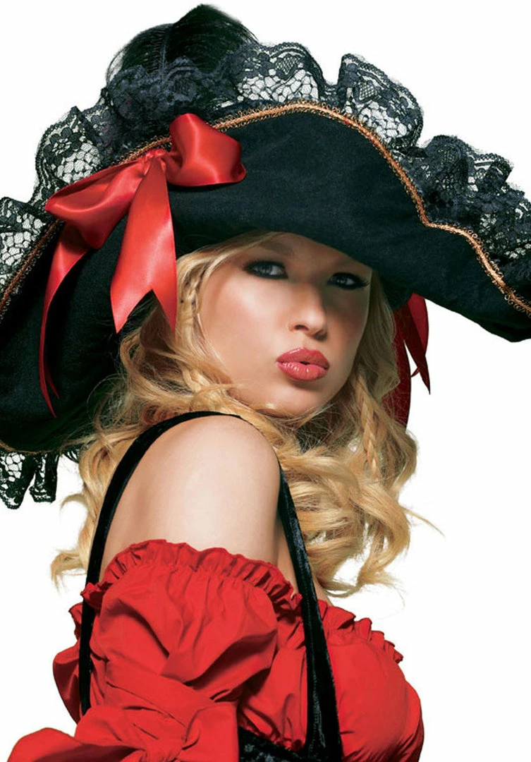 Our Leg Avenue Swashbuckler Hat with lacetrim and satin bow. why not add some of many accessories or a full costume to complete your pirate look.