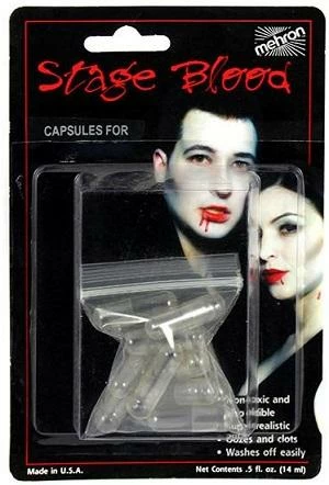 Blood Capsules by Mehron were developed for a realistic theatrical appearance both for on stage and film.