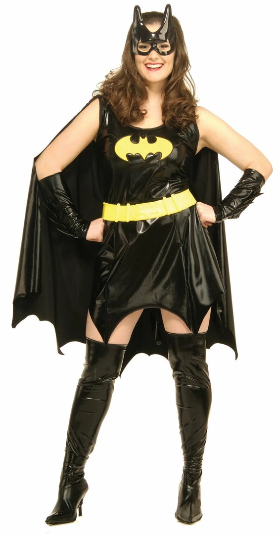 Transform in to the sexiest superhero around in this officially licensed sexy batgirl costume. Includes a black dress with logo and attached cape, two glovelets, vinyl eyemask, vinyl belt and boot tops.
