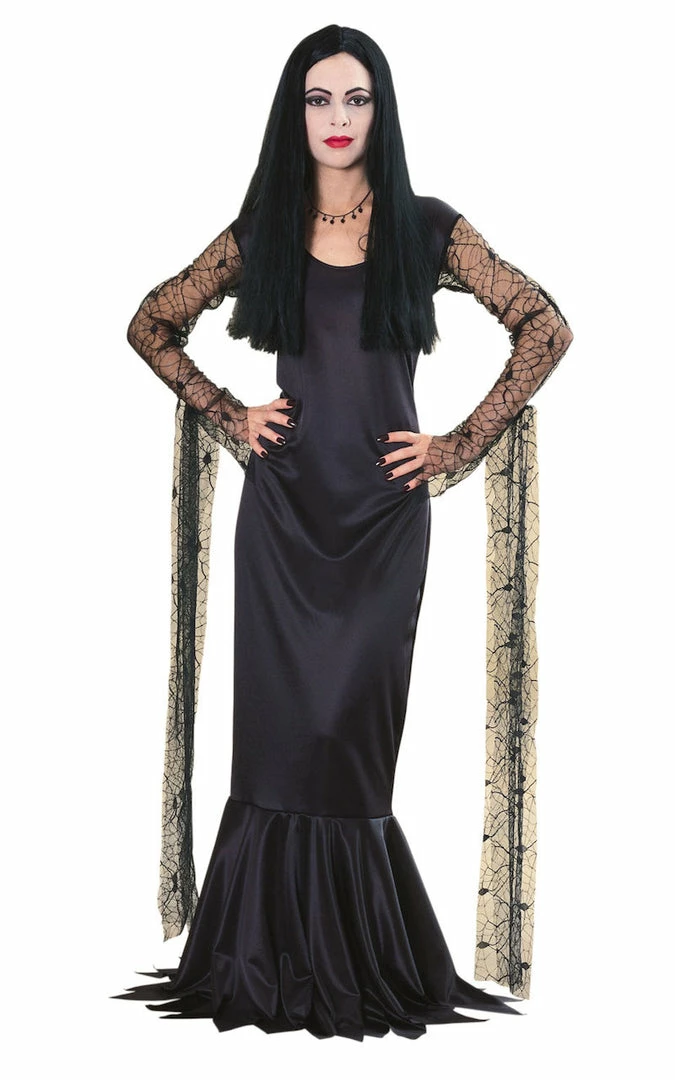This licensed Addams Family includes a full length dress in satin with mermaid skirt and jagged hemline, with full length lace sleeves with satin cap at top and spiderweb look to lace