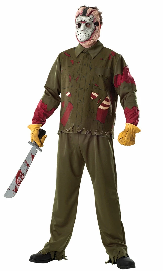 This licensed Friday the 13th costume includes a long sleeve green shirt, matching green trousers and a vinyl 1/2 face character mask.