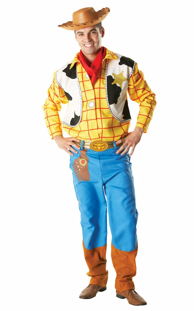 Our Woody costume, from Toy Story includes a top with mock waistcoat with printed sheriff badge and buttons, and trousers with printed belt and gun holster.