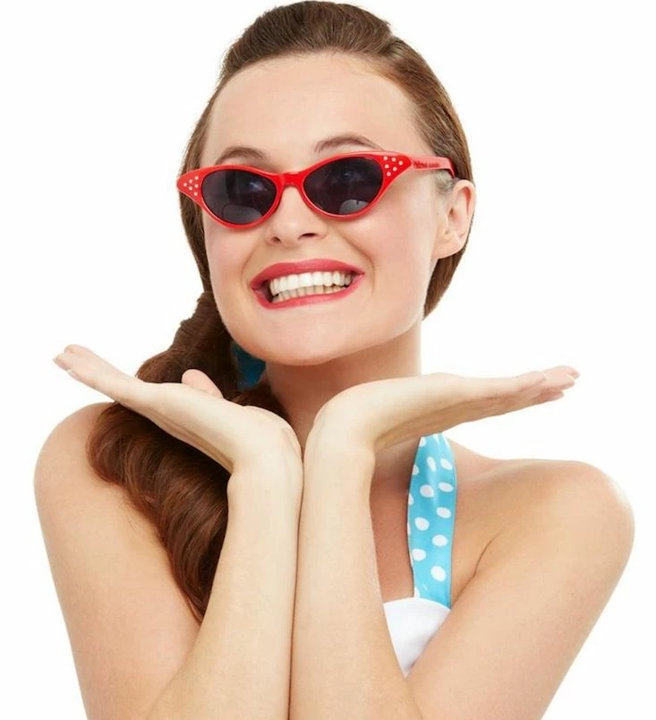 Our Red 50’s Style Sunglasses are great to pair with any 50’s style costume, complete with Diamante decoration.