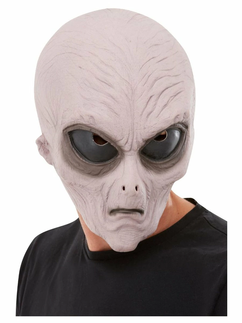 Our Alien Face Mask is a Full Over the Head Purple-Grey Latex Mask with big daunting Black Eyes.