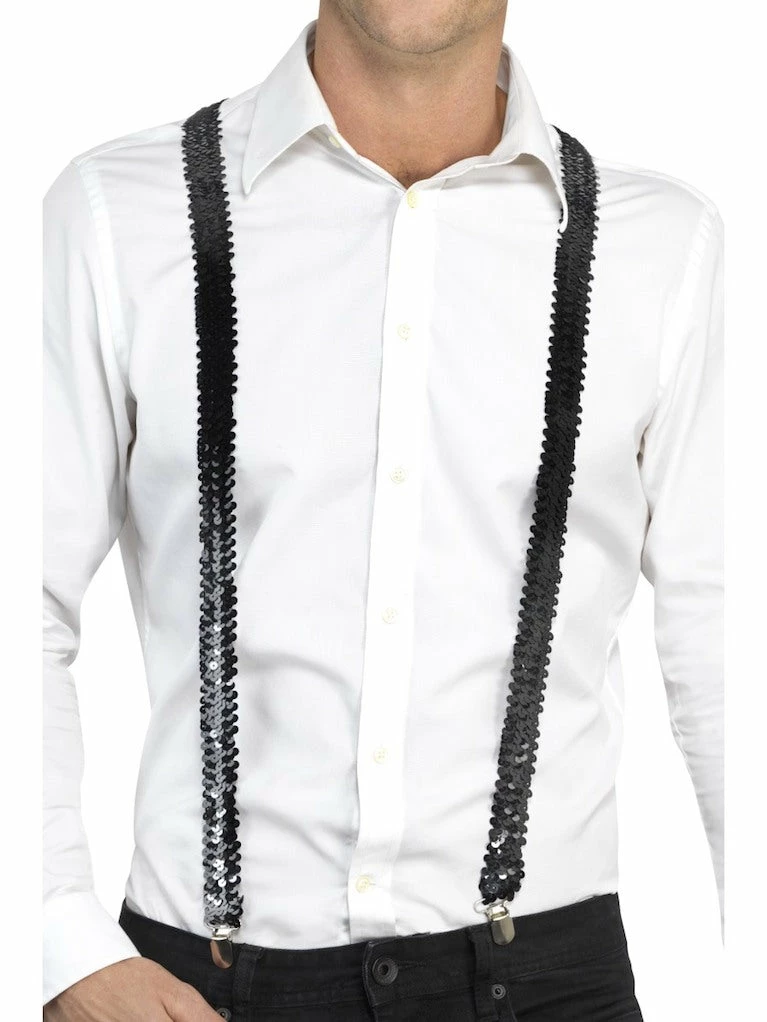 Our black sequin elasticated braces will complete a wide range of fancy dress costumes, perfect for Dance Troupes, Showgirls and Greatest Showman.