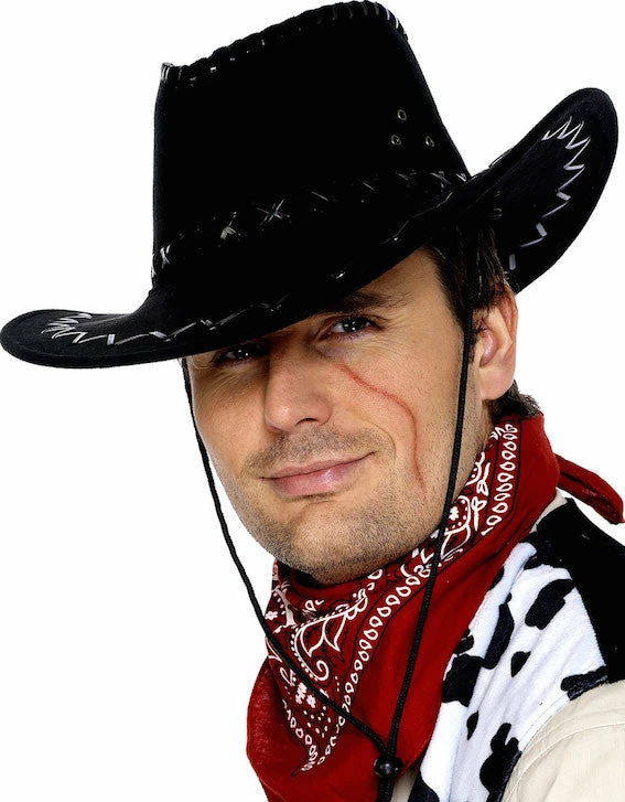 Our Black, Suede Effect Cowboy hat has decorative stitching around the rim, perfect for any wild west themed fancy dress party.