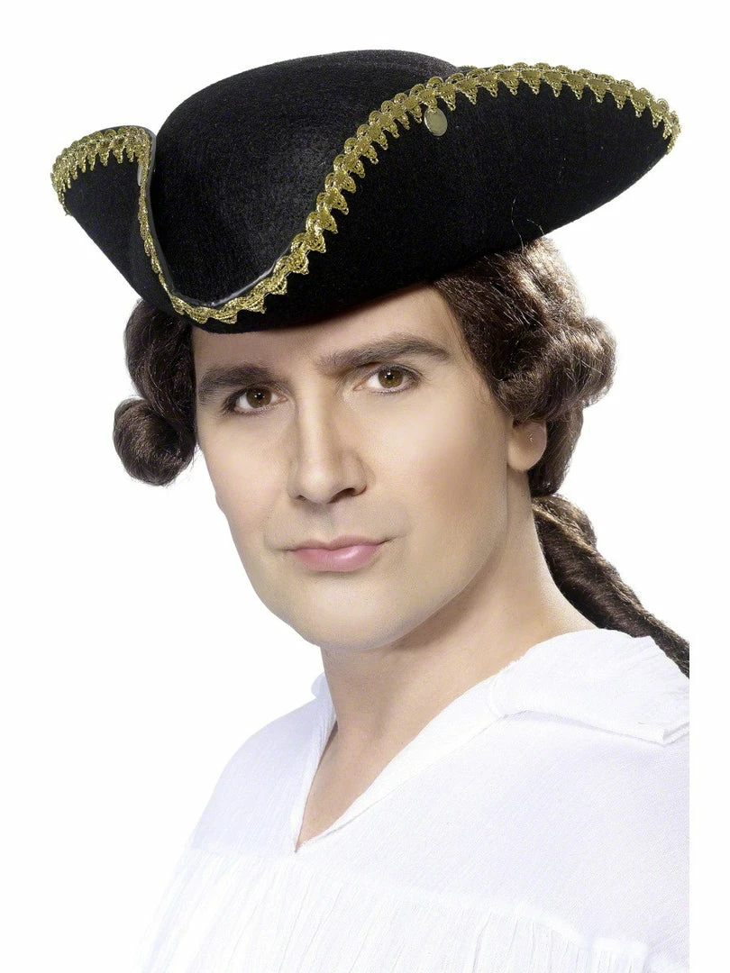 Our black Dick Turpin Tricorn Hat is felt with Gold shiny trimming. Next time you are riding Black Bess along the highway, this Dick Turpin Tricorn Hat will be the perfect thing to wear.