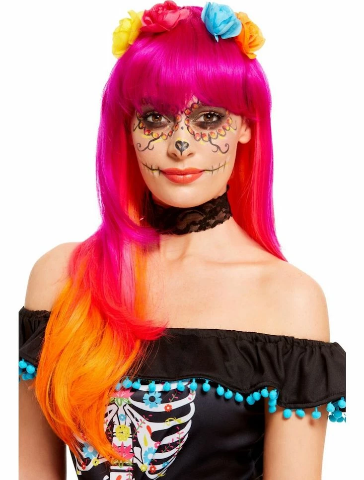 Our Pink and Orange Flowered Glam Wig is perfect for Hawaiian or Day of the Dead occasions.