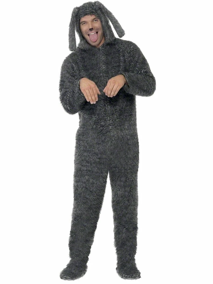 Includes All in one Fluffy Dog Costume with feet covers and floppy ears.