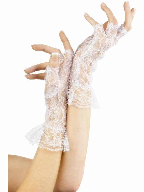 These beautiful white fingerless gloves with a lace trim are perfect to add the finishing touch for many costumes.