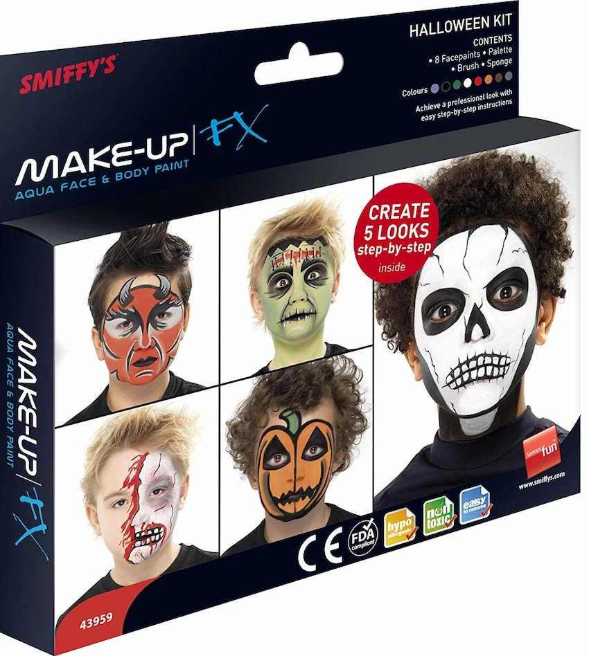Our Halloween palette includes 8 face paints, sponge and brush.