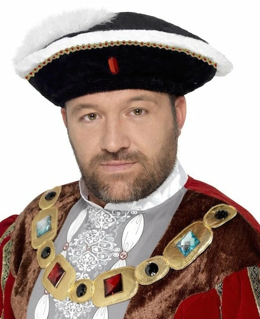 The hat is Black with White Fur Trim along with a Red Jewel in the Centre.