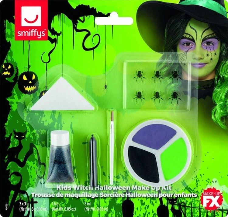 Our Children’s, Halloween Witch Make up Kit includes, 3 Coloured Cream Face Paints, Stickers, Glitter, Crayon, Sponge and Brush.