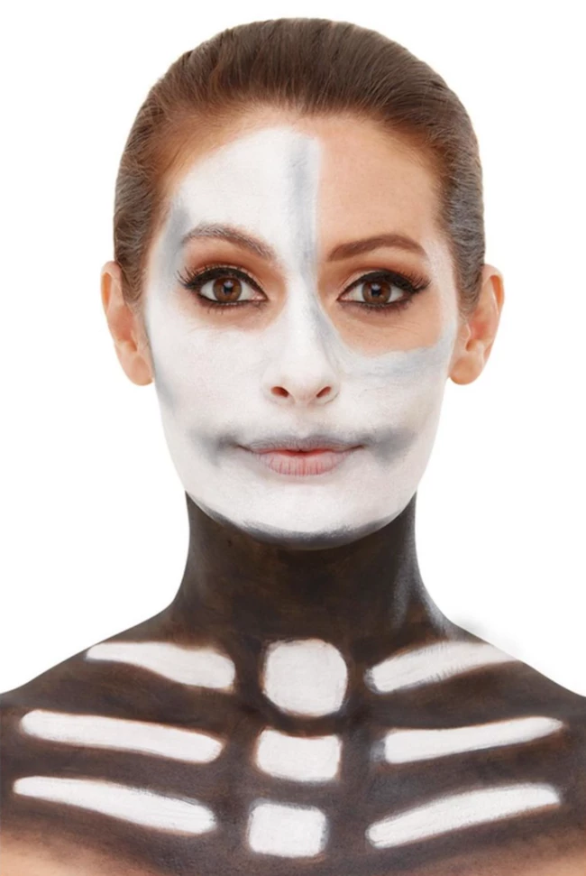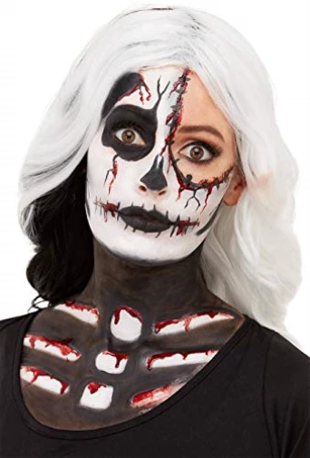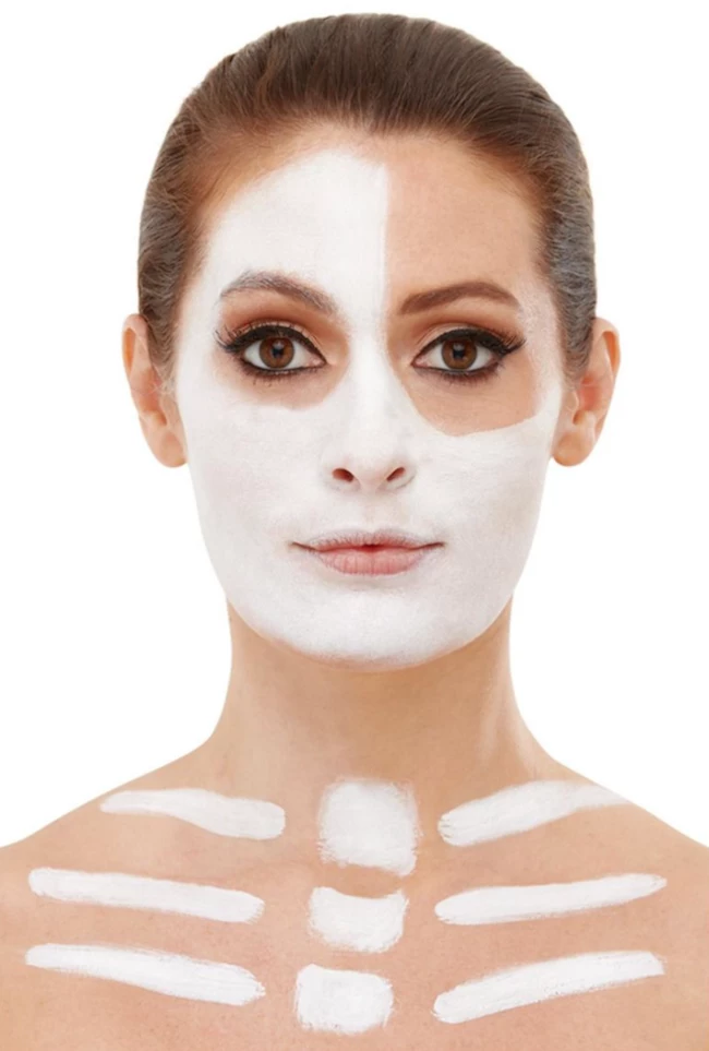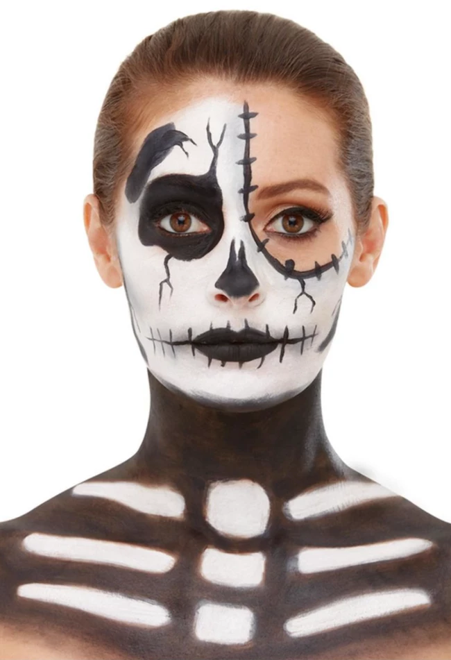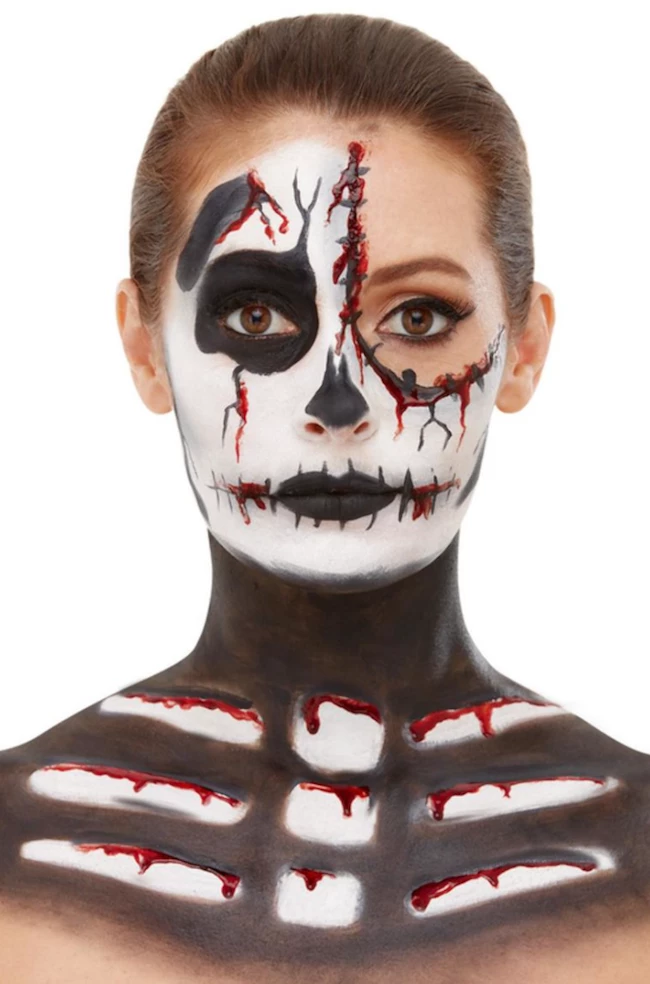 Our Skeleton Make-Up Kit includes black and white cream face paints, crayon, blood and a sponge.
