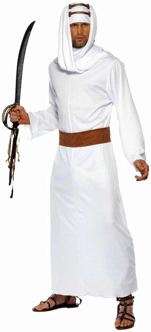Our Lawrence of Arabia costume Includes a white gown, headpiece and belt.
