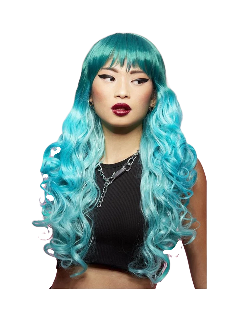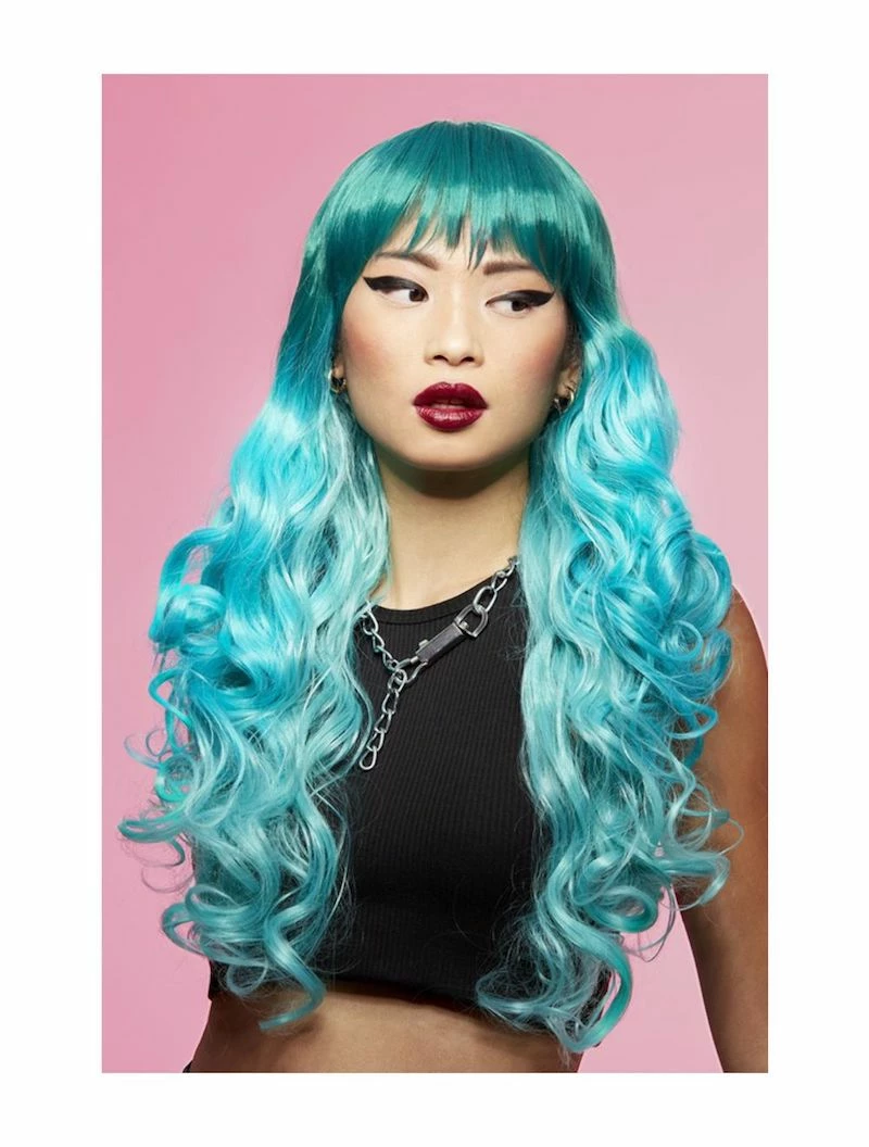Our Manic Panic, Mermaid Ombre Siren Wig, is very long with heavy curls and straight fringe.