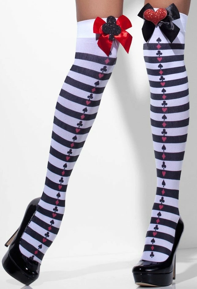 Our Opaque, Black & white striped hold ups with matching bows and heart prints will add that finishing touch to your costume.