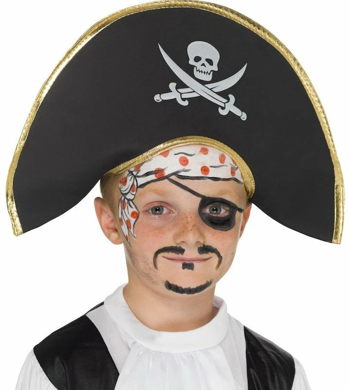 Our children’s Pirate Captains Hat includes skull and crossbones print on black gold eva foam with gold trim detail perfect finishing touch to your outfit.