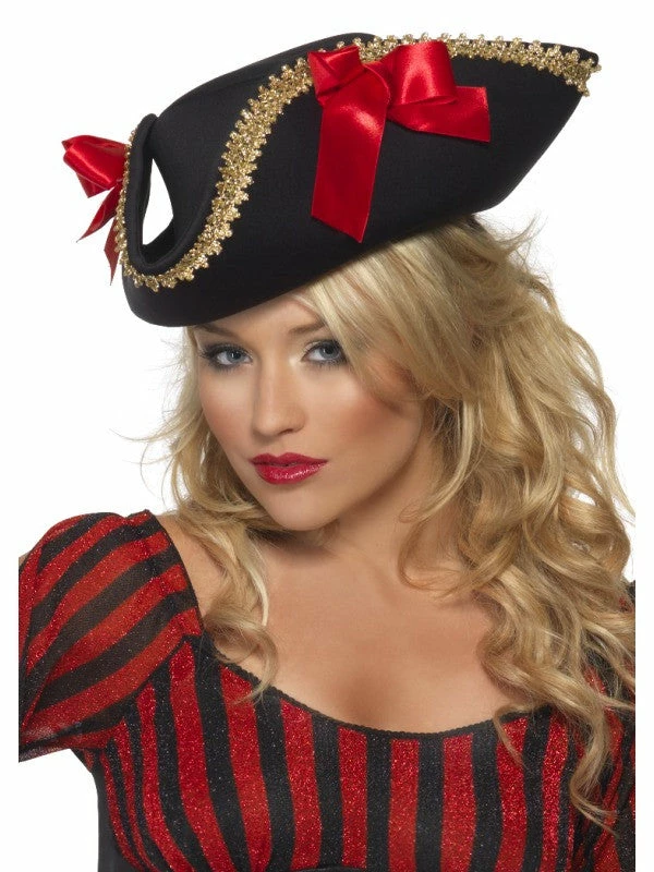 Perfect to complete many of our sexy pirate costumes, this tricorn style pirate hat comes with gold braid and red bows.