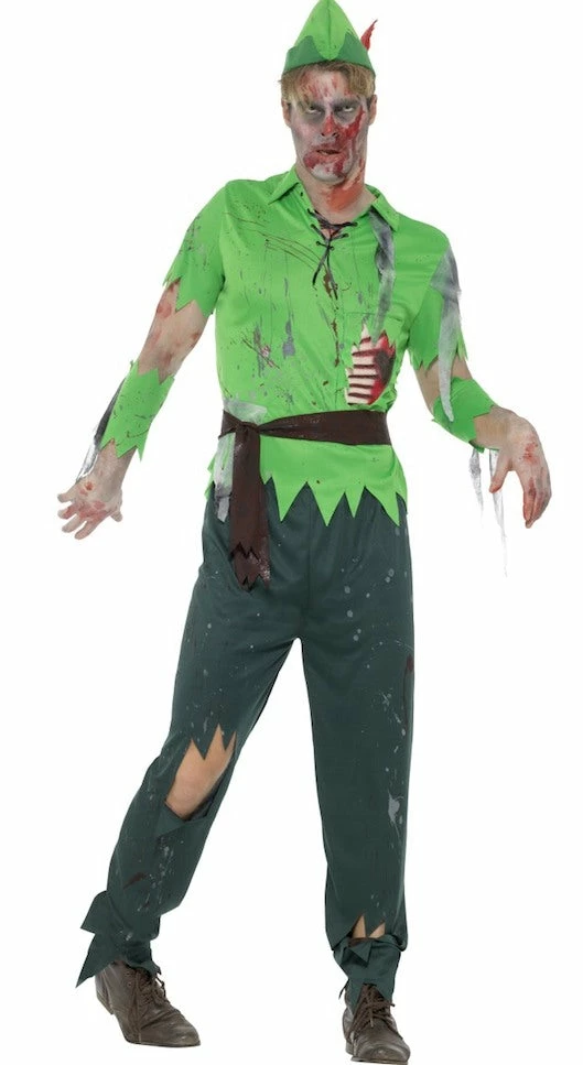 Return to Neverland this Halloween with our Peter Pan inspired Zombie Lost Boy Costume which includes, Blood stained Top with latex ribs, Ripped Trousers, Hat, Belt and Wrist cuffs