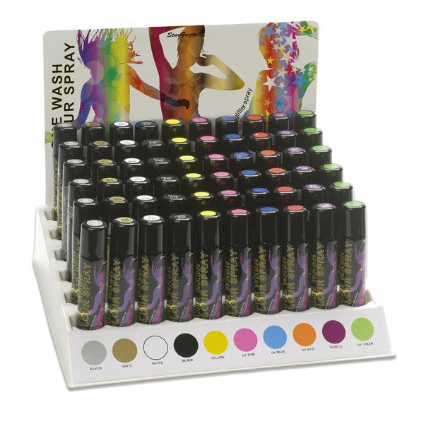 Our temporary UV Blue hair colour spray, by Stargazer, can be applied with ease and washed out in one wash.