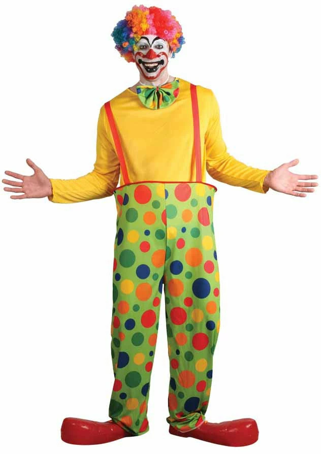 Includes hooped spotty clown trousers and large bowtie.
