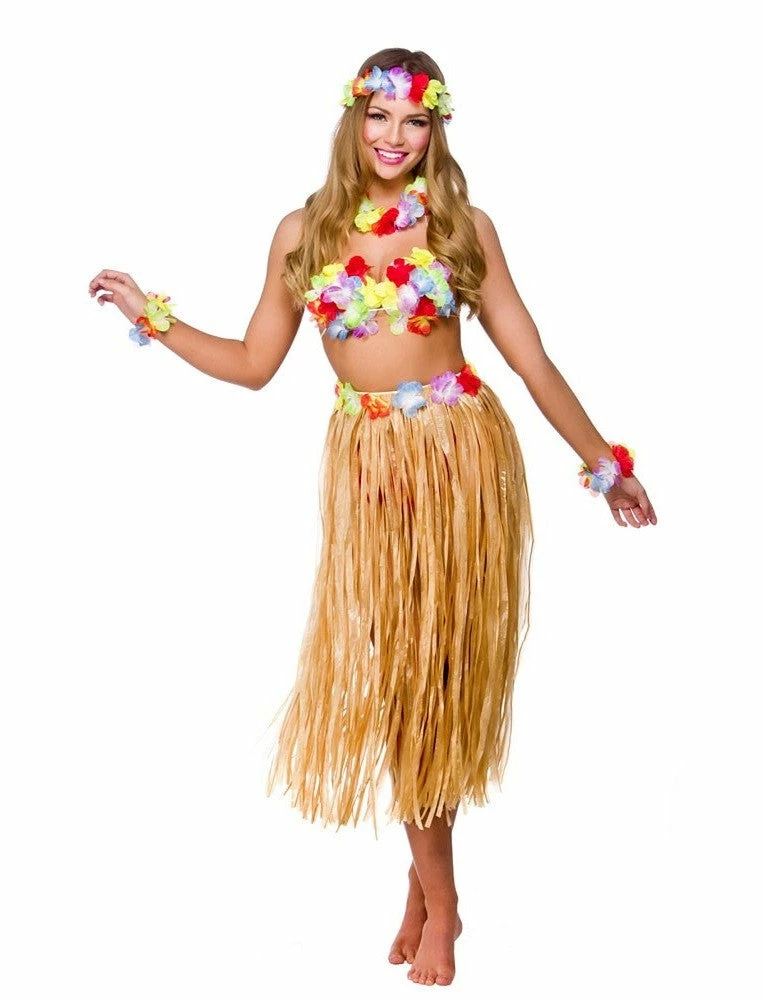 Our Hawaiian Party Girl set includes flower bra, grass skirt with flower trim, lei, arm pieces and head piece.