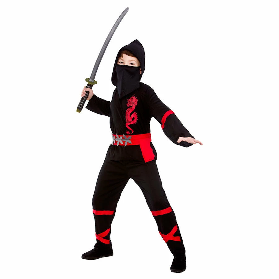 Our Black, Power Ninja comes complete with Shirt with Hood, Mask, Trousers & Belt
