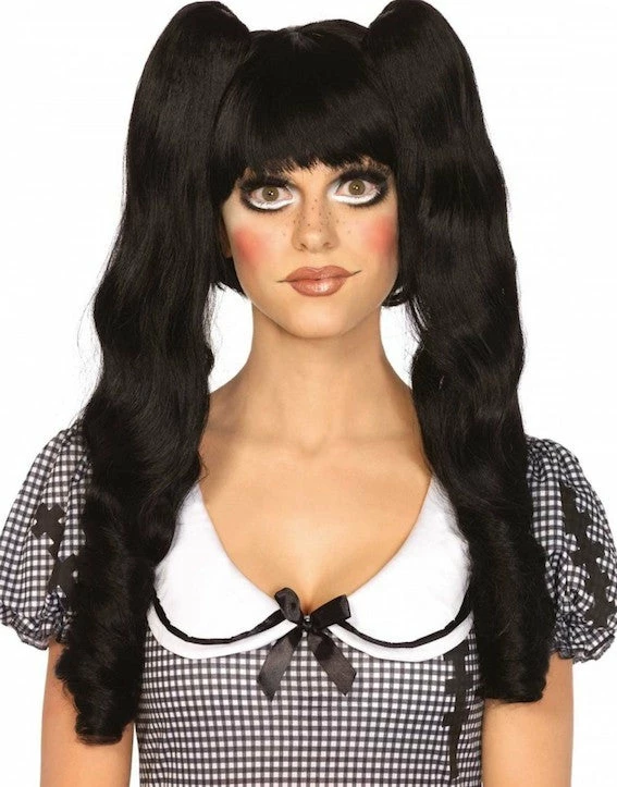 Our Black, Dolly Bob Wig With Clip On Pony Tails includes bob wig and optional ringlet clips